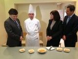 Un plato que los asistentes pudieron degustar gracias a la gentileza del restaurante La Codorniz, cuyo otro propietario, junto a Alfonso, Lino García, acudió también hoy a la Embajada. La Codorniz ofreció también una degustación de productos Segovianos: Judiones, cochinillo marca de garantía y morcilla en hojaldre con bacon y mermelada de reineta e higos. Al finalizar, el presidente de la Diputación regaló al embajador una botella de vino blanco de Bodegas Herrero, de Nieva.