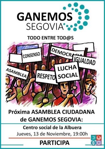 Ganemos Segovia tendrá la fuerza social que necesita con la participación de segovianas y segovianos que quieran comprometerse con el anhelo de una democracia real. Ven a construir juntos, GANEMOS SEGOVIA.