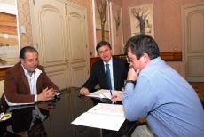 Las mesas de la Lonja Segoviana, que fijan semanalmente los precios de distintos productos agrícolas y ganaderos, se han reunido este viernes por primera vez en la diputación de Segovia, donde celebrarán a partir de ahora sus encuentros semanales. En la fotografía, el presidente de la diputación, Francisco Vázquez, da la bienvenida a los integrantes de la mesa del porcino, en presencia del presidente de la lonja, Carlos González, y el diputado de Promoción Económica, Rafael Casado.