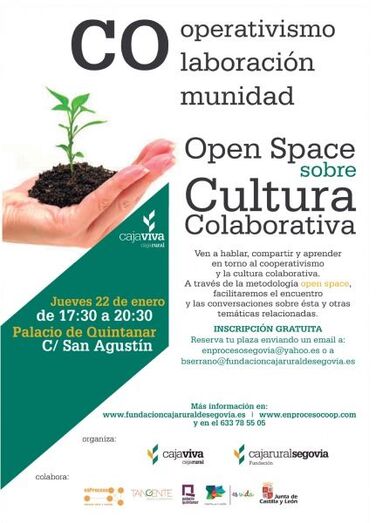 Sobre las diferentes posibilidades que ofrece la colaboración se hablará en este Open Space, una metodología de trabajo que es colaborativa en esencia y que facilita el encuentro y la generación de conversaciones en torno un tema, en este caso, la colaboración y la cooperación.