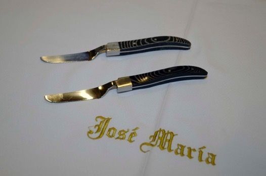 Ni José María ni su hija Rocío han querido desvelar cuánto cuesta este cuchillo, porque aunque han patentado su diseño y hasta varios nombres, 'cuchinillo' y 'tranchete' o 'trinchete', no está pensado para comercializarlo, sino para aportar valor añadido al servicio del restaurante José María. Exactamente esas tres palabras: 'José María, Restaurante', son las que figuran en las virolas de cada pieza tratada de forma individual y forjada "diente a diente, cuchillo a cuchillo".