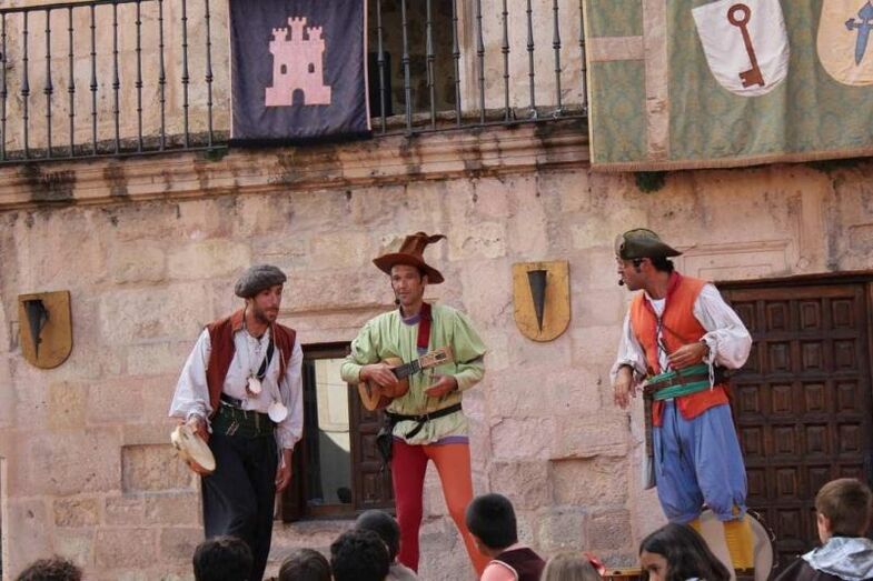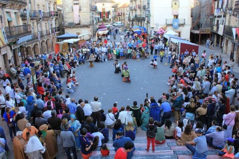 Durante los dos días que dura la feria, el gran mercado medieval que invade la plaza y las calles aledañas y que está compuesto por cerca de 50 artesanos y artesanas venidos de todos los puntos de la geografía española, se convierte también en escenario de numerosos espectáculos de animación: música, teatro, actividades infantiles… Cirko Psikario será la compañía encargada de llenar de vida y ambiente medieval la villa con sus pasacalles y actuaciones a lo largo de todo el día. Para los más pequeños se instalará una zona infantil en la Plaza de Santiago con actividades y atracciones y a las 18:30 horas, en la Plaza de España, la magnífica cuentacuentos Charo Jaular nos trasladará a la Edad Media con “La Princesa que quería volar con las palabras”.