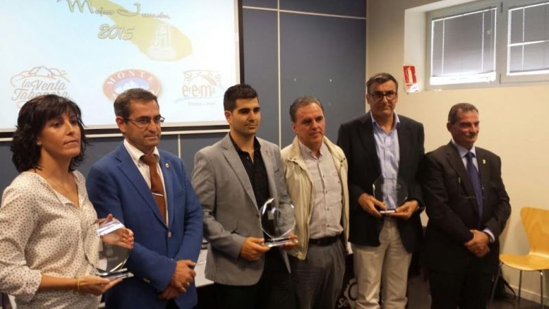 En la imagen, los representantes de las empresas galardonadas: en la categoría de blanco, la Venta Tabanera; en ibérico de cebo, Eresma de Coca; y en ibérico de bellota, Montenevado de Carbonero el Mayor, junto al diputado de Promoción Económica, Jaime Pérez, y el presidente de la Asociación de Camareros, Pablo Martín.