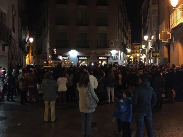Así sucedió en el caso de la procesión con Ntra. Madre María Santísima de las Angustias de la Asociación de Exalumnos Maristas (A.D.E.MAR), cuyo solemne acto de despedida por la Comunidad de Madres Clarisas congregó a un buen número de personas a las puertas de la Iglesia del Corpus Christi, en la calle Real. Posteriormente, el cortejo partió bajo la lluvia hacia el Colegio Marista, recordando el rezo del ‘Via Matris’. El trono de la Virgen fue portado a banzos, acompañando la cofradía titular.