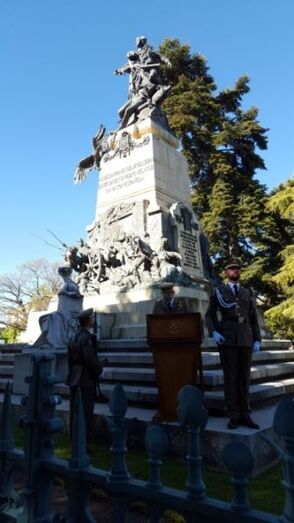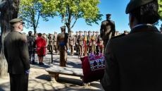 Para concluir el acto sólo quedaba honrar a los caídos con música y una corona de flores, que se encargaban de depositar bajo el monolito la alcaldesa Clara Luquero y el coronel director Alonso, y hacer sacar la cámara de vídeo a los turistas, mientras escuchaban y observaban atentos cómo los artilleros -y algún civil- presentes cantaban puntuales al ritmo "marchando siempre unidos, siempre unidos...".