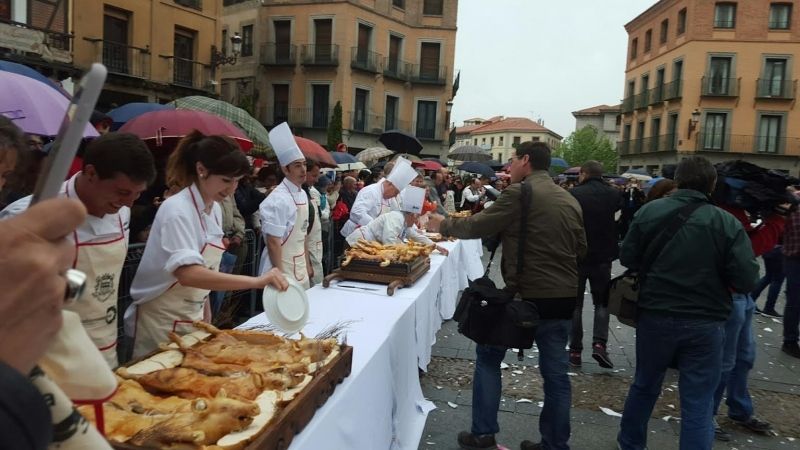 El presidente de los cocineros de Segovia, Ignacio García, puso todo su empeño para que las inclemencias no aguaran la fiesta e hizo gala de buen humor: “Vamos a comer cochinillo al vapor a temperatura ambiente”, bromeó. Así pues, tras las danzas de La Esteva y las canciones de la Ronda, los cocineros segovianos se colocaron el delantal y, a las órdenes de García, alzaron platos para trinchar casi medio centenar de cochinillos llegados en andas sobre una base de romero, para unas mil raciones. Tras el trinchado, los platos se estamparon en el empedrado. Cándido recordó que en esta fiesta siempre había hecho un tiempo estupendo y ya tocaba lluvia.