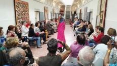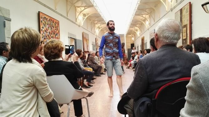Giráldez hacía de maestro de ceremonias e indicaba a los modelos momentos antes por dónde ir y pasar, y les alentaba durante el camino por la pasarela. El exconcejal animaba a los más tímidos y levantaba el pulgar a las más profesionales, mientras todos ellos paseaban estampados de flores, amarillos, tonos rosas y fucsias, azules, verdes, turquesas… Vestidos de vuelo y faldas ajustadas, largos trajes de fiesta, sombreros a modo de pamela y pantalones con túnica. De repente el blanco se convertía en color y algunos diseños, a excepción de un cuadrado de tonos intensos, mimetizaban con el color de la piel de los modelos. Mientras tanto, sonaba por megafonía música africana que, junto a los cuadros colgados de las paredes, contribuían a crear un ambiente de fiesta.