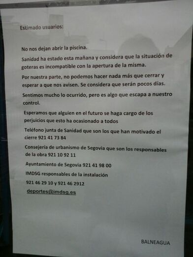 No nos dejan abrir la piscina. Sanidad ha estado esta mañana y considera que la situación de goteras es incompatible con la apertura de la misma. Por nuestra parte, no podemos hacer nada más que cerrar y esperar a que nos avisen. Se considera que serán pocos días. Sentimos mucho lo ocurrido, pero es algo que escapa a nuestro control. Esperamos que alguien en el futuro se haga cargo de los perjuicios que esto ha ocasionado a todos.