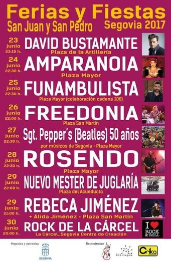 Los conciertos que este año se podrán ver en Segovia dentro de la programación municipal de las Ferias y Fiestas de San Juan y San Pedro 2017 serán los siguientes:
