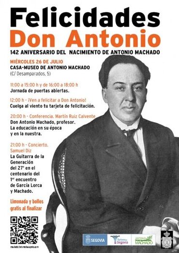 Bajo el lema ¡Ven a felicitar a don Antonio! Turismo de Segovia ha organizado una fiesta que dará comienzo a las 12:00 h con la realización de tarjetones de felicitación con los que adornaremos el jardín de la pensión donde vivió el poeta.