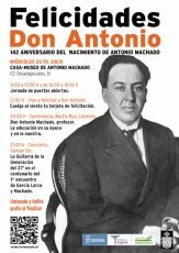 La Casa-Museo de Antonio Machado se convertirá en una fiesta para celebrar el 142º aniversario del nacimiento del poeta. Será este miércoles, 26 de julio, cuando el número 5 de la calle Desamparados se alegrará con actividades como una jornada de puertas abiertas; la conferencia “Don Antonio Machado profesor. La educación en su época y en la nuestra” por Martín Ruiz Calvente; un concierto de guitarra de Samuel Diz; y tarjetones de felicitación a Don Antonio.
