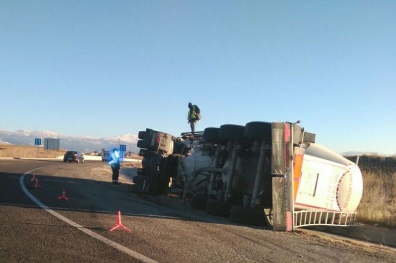 Un camión-cisterna ha volcado este lunes, 4 de diciembre, en la rotonda de Bernuy de Porreros, en la provincia de Segovia, según han compartido sobre las 15:30 horas usuarios de un grupo de información vial de Segovia de Telegram, que incluso han enviado varias fotografías, en las que se podía ver el camión volcado en la cuneta y a agentes de la Guardia Civil en la zona. El servicio de Emergencias 112 de Castilla y León, consultado por ‘SegoviaDirecto.com’ sobre las 17:15 horas, a esa hora no tenía constancia de ningún accidente con heridos en la provincia de Segovia.
