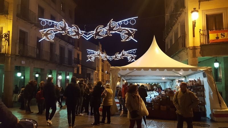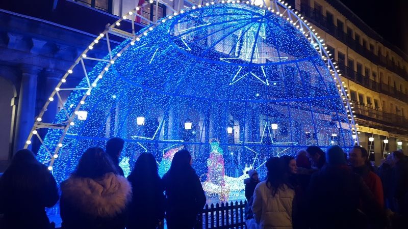 A las siete de la tarde, con un mando a distancia, Clara Luquero dio la orden de encender más de cien arcos colocados en las calles comerciales, en determinados enclaves urbanos como la Plaza Mayor, donde se han decorado los árboles y la fachada del Ayuntamiento y este año, como novedad, se ha ubicado un enorme pesebre de 6,5 metros de altura por 12 de ancho que ha sido muy criticado por los hosteleros de los soportales.