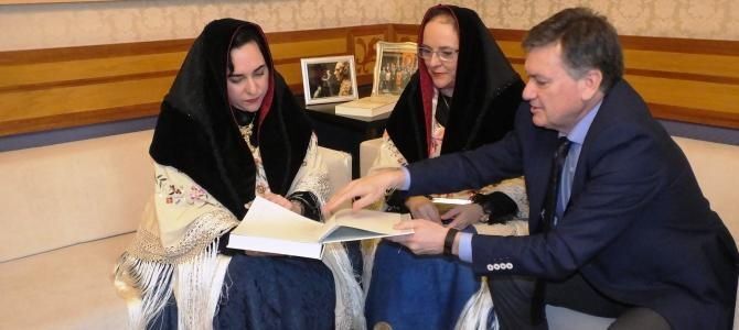 En la institución provincial, su presidente, Francisco Vázquez ha obsequiado a las hermanas De Andrés, como es tradicional, con una escultura de bronce de Juan Pablo Herrero en la que aparece una cara de una alcaldesa con la montera puesta. Asimismo, les ha regalado el libro de Carlos Porro ‘Etnografía de la imagen en Segovia. La colección del Padre Benito de Frutos’, editado por el Instituto de la Cultura Tradicional Manuel González Herrero; un ejemplar que también le ha sido entregado a Juan Carlos Cuesta, párroco de Zamarramala, quien ha acompañado en su visita a las alcaldesas.
