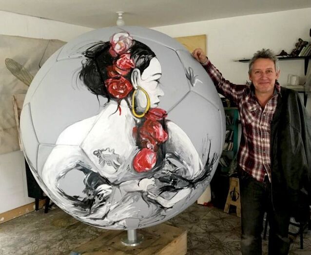 El balón de fútbol monumental, de metro y medio de diámetro, lleva por título ‘Raíces Ibéricas’ y representa a “la furia roja”, como se conoce a la Selección, a la cultura y a las tradiciones españolas. Inspirado en el flamenco, muestra una bailaora y una guitarra española. “Ahí están tus raíces y fuera de tu tierra lo sientes más”, reconoce.
