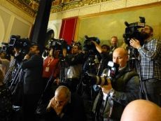 El Salón de Reyes a rebosar, entre autoridades de los tres niveles, figuras de los estamentos locales, premiados con sus familias (algunas verdaderamente numerosas) y una buena representación de plumillas, también de los tres niveles, respaldados por los gráficos aupados en un estaribel dispuesto al efecto.