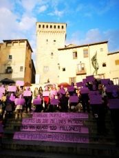 La lluvia intermitente no impidió que Segovia volviera a salir a la calle en una reivindicación que se ha vuelto a reproducir en más de 70 ciudades españolas. En las escaleras de San Martín, se escenificó con caretas y carteles morados y, de nuevo, con un micrófono abierto. En el acto se pudo ver a varios políticos segovianos, como la alcaldesa, Clara Luquero; la concejala de Obras, Paloma Maroto; el de Hacienda, Alfonso Reguera; la diputada regional de Podemos, Natalia del Barrio; o el portavoz de IU, Ángel Galindo, entre otros.