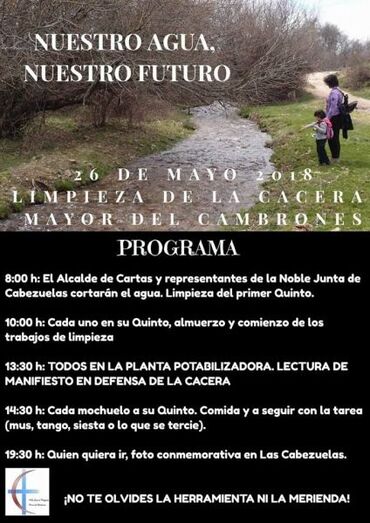 Este año 2018, el Día de la Cacera Mayor del Cambrones ha vuelto a ser histórico. Como cada último sábado de mayo desde tiempo inmemorial, los vecinos de la Noble Junta de Cabezuelas, habitantes de Sonsoto, Trescasas, San Cristóbal de Segovia, Tabanera del Monte, Palazuelos de Eresma y La Lastrilla, beneficiarios de los derechos históricos del agua, se han vuelto a reunir para honrar la memoria del agua y limpiar juntos la Madre, la Cacera Mayor del Cambrones. Pero este año 2018 no ha sido como los demás. Ante la pretensión de la Confederación Hidrográfica del Duero (CHD) de extinguir esos derechos seculares del agua, los miembros de todos los pueblos de la Noble Junta de Cabezuelas se han reunido este día de manera excepcional para pedir en un Manifiesto a sus ayuntamientos que defiendan ante el organismo de cuenca los derechos históricos y públicos del agua. En este día, a diferencia de los anteriores, también ha subido a la Madre, impulsada por las mujeres, el AMPA con los niños del colegio de Trescasas, acompañada de historiadores y montañeros, cuyas reivindicaciones sobre los derechos de las mujeres y sobre la Sierra de Guadarrama también han estado muy presentes.