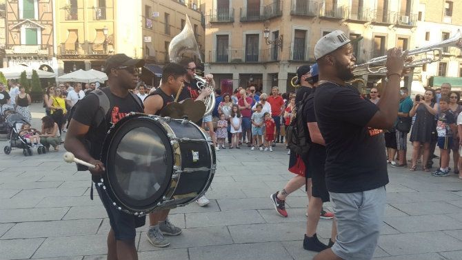 En la tarde de este viernes, 22 de junio, día del comienzo oficial de las Fiestas y Ferias de San Juan y San Pedro, por la Plaza del Azoguejo ha desfilado la alegría de las ‘marching bands’ participantes en Femuka 2018, de camino a San Martín: The Funky Dawgz Brass Band (USA), BefunkbopBrass Band (España), Shambaiala Batukada (España), y El Puntillo Canalla Brass Band (España).