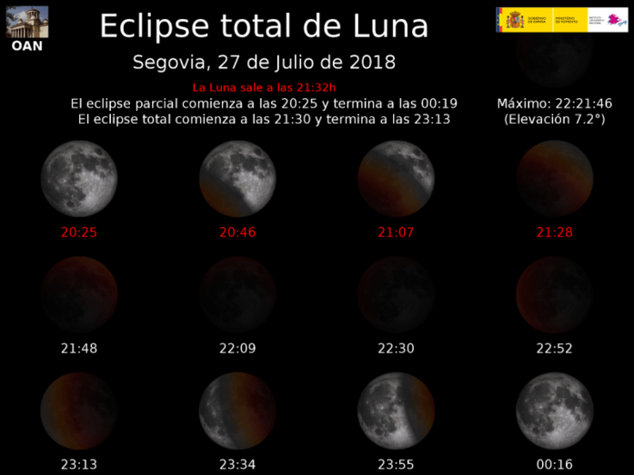Este viernes, 27 de julio, se producirá un eclipse total de luna, que será perceptible a simple vista desde toda España. También desde Segovia, donde el eclipse parcial comenzará a las 20:25h. Y finalizará a las 00:19h. El eclipse total podrá verse en la ciudad del Acueducto desde las 21:30h. hasta las 23:13h., según el Observatorio Astronómico Nacional.