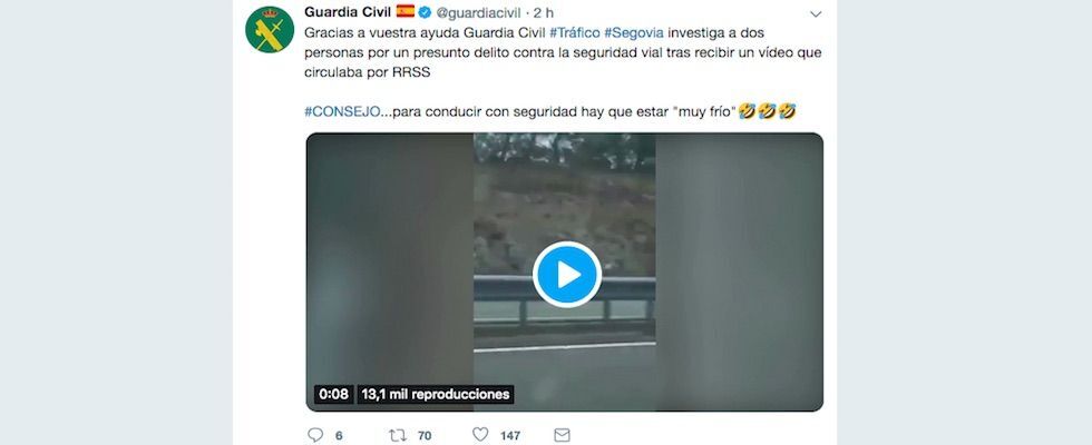 La Guardia Civil de Segovia investiga a dos personas por delito Contra la Seguridad Vial por conducir de modo manifiestamente temerario. El Grupo de Investigación y Análisis de Tráfico del Subsector de Tráfico de Segovia tuvo conocimiento de la existencia de un video que circulaba en las redes sociales en el que se podía observar como supuestamente el conductor de un turismo mientras conducía mantenía relaciones íntimas con su acompañante.