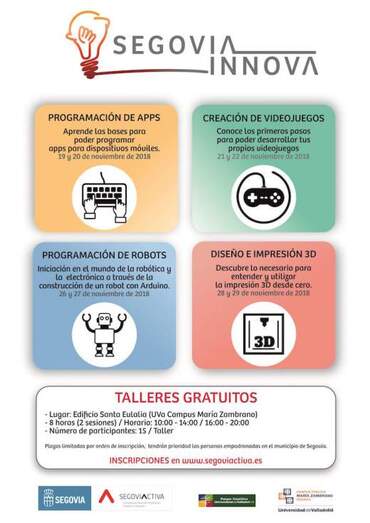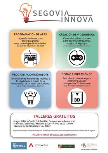 El primero de los talleres, Programación de APPS, se desarrollará el 19 y 20 de noviembre. En él, se enseñará a aprender las bases para poder programar apps para dispositivos móviles. El segundo, los días 21 y 22, los participantes podrán conocer los primeros pasos para poder desarrollar sus propios videojuegos en el taller Creación de Videojuegos.