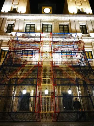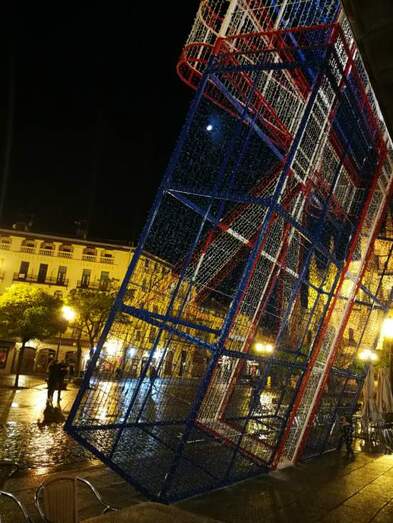La caja de regalo gigante y luminosa, principal novedad de las luces de las Navidades de este año en Segovia, 'se cae' sobre la fachada del Ayuntamiento, tal y como muestran las fotos. Fuentes municipales han explicado a 'SegoviaDirecto.com' "que no se ha caído, que es así. Incluso hemos movido las banderas para colocarlo". Este año, para intentar evitar las críticas del pasado, cuando Segovia fue la última capital de Castilla y León en encender la Navidad, el Ayuntamiento ha colocado las luces navideñas con mucha antelación. El encendido tendrá lugar el 5 de diciembre, en la víspera del Puente de la Constitución.