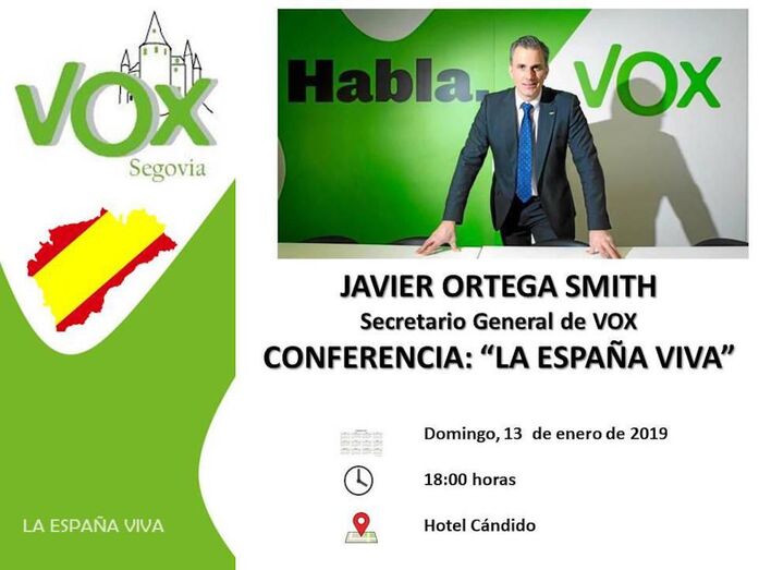 En el acto, también intervendrán el presidente provincial de Vox Segovia, Nazario Merino, y la vicesecretaria de Organización de Vox España, Salud Anguita, quien siendo edil en el Ayuntamiento de Jaén presentó una moción para instar al Gobierno de Rajoy a aplicar el artículo 155 en Cataluña y salió adelante con los votos del PP, siendo el primer pleno español en hacer el requerimiento.