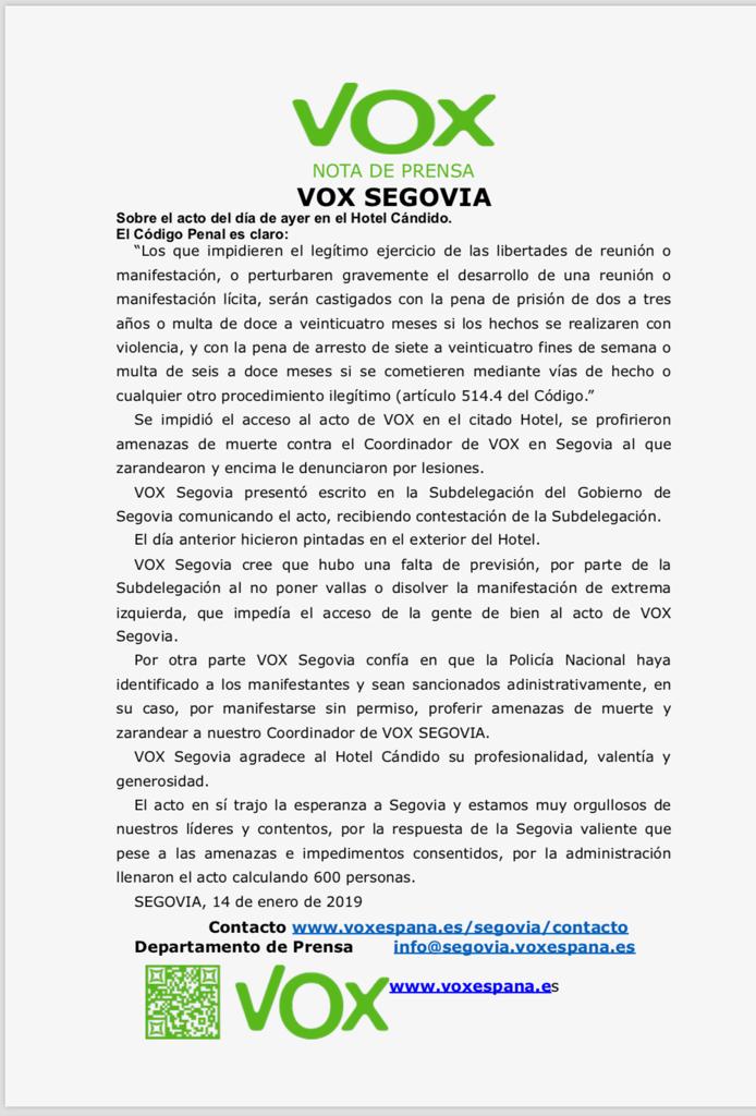Al respecto, Vox ha hecho público un comunicado en el que se refiere al acto en el Hotel Cándido. Al respecto asegura que “se impidió el acceso al acto de Vox en el citado hotel, se profirieron amenazas de muerte contra el coordinador de Vox en Segovia, al que zarandearon y encima le denunciaron por lesiones”.