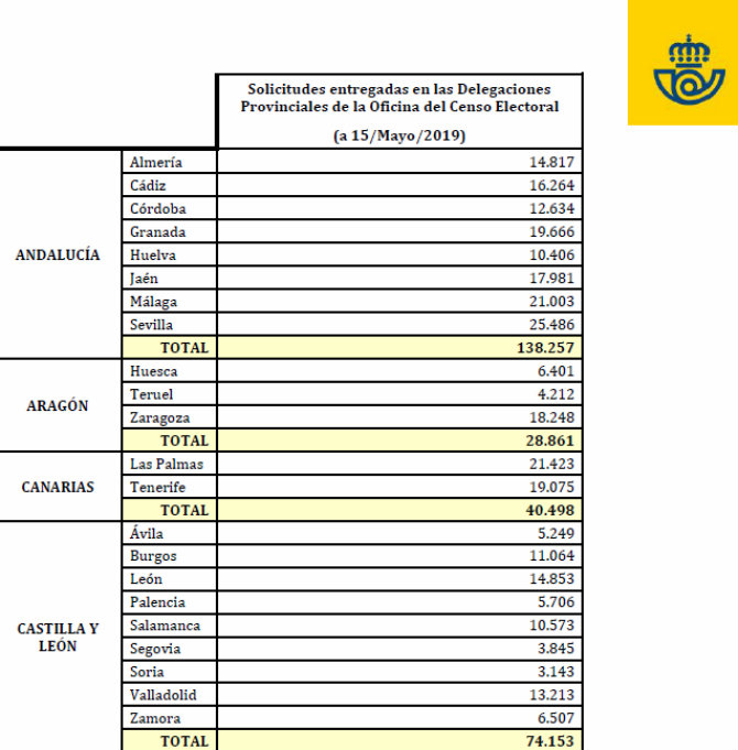 (Ver adjunta la tabla con las solicitudes de voto por correo entregadas en cada Delegación Provincial del Censo Electoral)