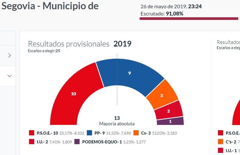 Con más del 90% del voto escrutado, en Segovia capital, el PSOE es el partido más votado, con diez concejales, seguido del PP, con nueve. Ciudadanos sube de dos a tres escaños. IU también gana uno, hasta dos. Podemos Equo entra en el Ayuntamiento de Segovia con un concejal. Centrados, que tenía dos concejales, se queda fuera. Al igual que Vox. Aunque PSOE pierde dos concejales respecto a 2015, puede elegir con quién gobernar, al poder conseguir mayoría absoluta tanto con Cs como con IU y Podemos Equo.