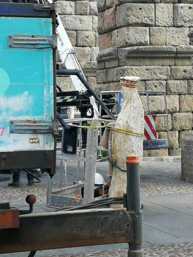 Luquero ha destacado la oportunidad única que se ha tenido en el día de hoy “de ver esta talla a la altura de los ojos, porque a partir de hoy espero que por muchos siglos, los segovianos la vamos a ver desde la lejanía y mirando hacia lo alto del Acueducto”, ha dicho. Mientras se preparaba la subida de la imagen, la alcaldesa ha manifestado su pesar por que la gente interesada no pudiera hacerse un ‘selfie’ con la estatua. “Podrán hacérsela con la original, cuando esté en la Casa de la Moneda”, le informaron los técnicos.