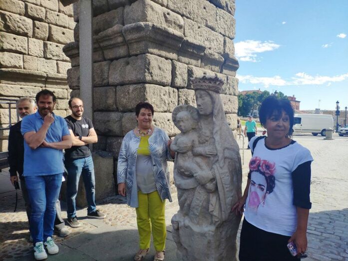 Este martes, 18 de junio, la Virgen ha vuelto a ser colocada en el Acueducto de Segovia, en medio de una gran expectación. “Se la puede tocar, es una réplica”, apuntaba la alcaldesa de Segovia, Clara Luquero, junto a la imagen, que con 1,60 m. de altura, ha pasado de los 800 kilos de la original a pesar menos de 50.
