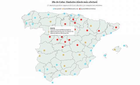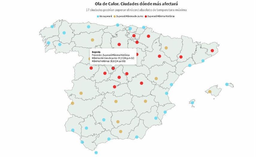 En esta ola de calor, Segovia podría superar su temperatura máxima histórica. Según el mapa elaborado por Porcentual.es a partir de los datos de la Agencia Estatal de Meteorología (AEMET), la temperatura máxima de Segovia en el mes de junio es de 37,3 grados, que se alcanzaron el 26 de junio de 2012. La máxima histórica se alcanzó el 24 de julio de 1995, alcanzando los 38,6 grados Centígrados. Ya puedes ver el mapa de Porcentual de la ola de calor, donde se prevé que 17 ciudades, Segovia entre ellas, podrían superar el récord absoluto de temperatura máxima.