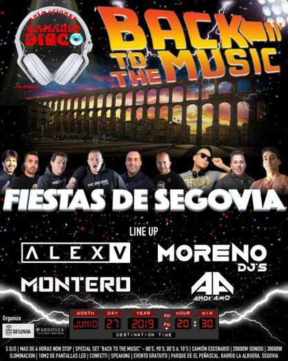 20:00.- BACK TO THE FUTURE, noche de sesiones de los DJs segovianos Alex V, Moreno DJs, Montero y AndiAmo en la que pincharán éxitos de todos tipos de música (pop, dance, reguetón, electrónica), desde los 90 hasta hoy. A cargo de Canario Disco. En el parque de La Albuera, con entrada libre.