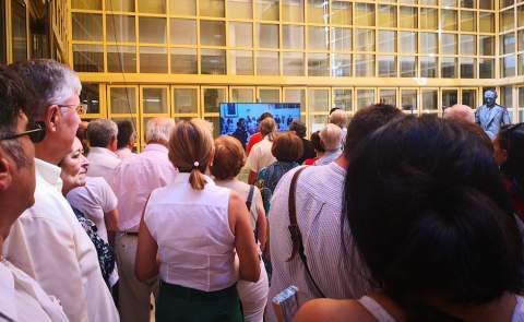 [Img #51986]Hasta la bandera estaba el Consistorio este viernes. En las gradas de invitados del Salón de Plenos se ha podido ver a numerosos cargos políticos de los distintos partidos, además de familiares, amigos, invitados y medios de comunicación. Tanta ha sido la expectación que se ha tenido que habilitar una pantalla en el Patio del Ayuntamiento para que todos los numerosos asistentes pudieran seguir el acto.