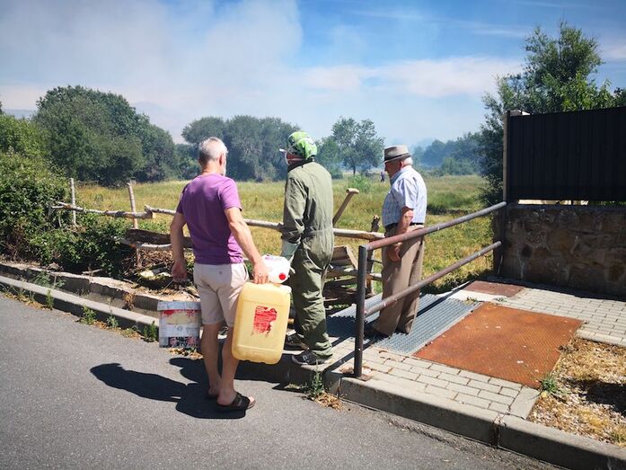 Álvaro, vecino que refrescaba con una manguera una de las parcelas de la calle El Caz donde han entrado las llamas, ha informado que "el fuego ha quedado muy cerca de las casas de unos primos nuestros por ahí, era cuando más avivado estaba, luego el fuego ha saltado por la parte de abajo del pueblo y luego por arriba. Y ha seguido hacia la iglesia y hacia la fábrica de Bezoya. Y bueno, nada, Todo el pueblo a una, muchos nervios, pero bien. Estamos mojando el terreno, porque se ha avivado ya dos veces, hay maderos que están ardiendo…".