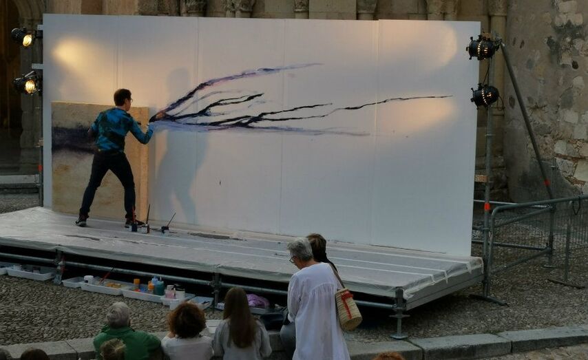 Ya por la tarde, el artista se apostó ante la iglesia de San Martín para realizar una de sus acciones pictóricas en directo. Y, en su línea, traspasó las fronteras del lienzo, inspirado por el piano de Jorge Nava, hasta el anochecer. “Voy a expandir una instalación pictórica, que he hecho ex profeso para este Hay Festival. Se trata de crear una simbiosis con el público, pero también con el espacio. El espacio va a ser el taller. La mente abierta, el espacio abierto, es el instrumento que nos va a unir a todos y va a hacer que haya una acción intercultural dentro de las normas de la globalización”, explicó.