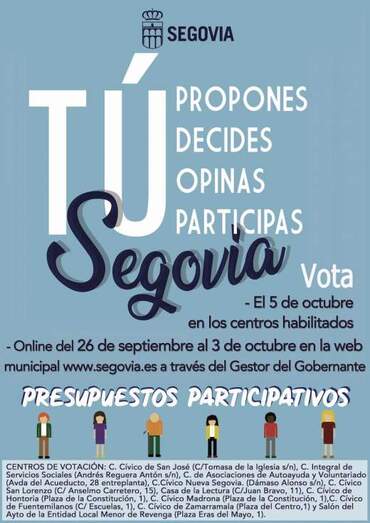 Quienes lo prefieran podrán votar en persona el 5 de octubre, de 9:00 a 20:00 horas, en los centros municipales habilitados: centro cultural de San José (calle Tomasa de la Iglesia s/n); centro integral de Servicios Sociales de La Albuera Jesús Mazariegos (calle Andrés Reguera Antón, s/n);  el centro de asociaciones de Autoayuda y Voluntariado (avenida del Acueducto 28); la Casa de la Lectura (calle Juan Bravo, 11) los centros cívicos de Nueva Segovia (Anexo al pabellón Pedro Delgado. Calle Dámaso Alonso s/n), San Lorenzo (calle Anselmo Carretero, 15); Hontoria, Madrona, Fuentemilanos y Zamarramala, y el salón del Ayuntamiento de la entidad local menor de Revenga.