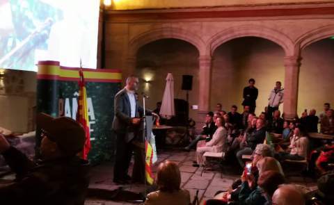 Javier Ortega Smith ha comenzado su discurso alabando el histórico hotel San Antonio El Real y criticando a los que “tergiversan el pasado y quieren que ese pasado nos enfrente a los españoles”. También ha cargado contra la ideología de género, en especial contra "las feminazis, que se niegan apoyarles cuando reclaman cadena perpetua para un criminal que asesina a a una mujer, un pederasta o un violador".