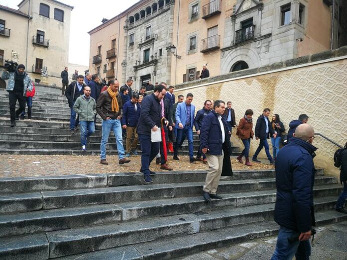 Terminado el acto electoral, la nube de cargos socialistas, dispositivo de seguridad  y medios de comunicación que rodeaba a Pedro Sánchez ha caminado hacia el Acueducto, abriéndose paso entre los turistas Calle Real abajo. Tras dejar Segovia, el presidente en funciones se ha dirigido a Salamanca primero y a Zamora después, donde intervendrá este día 23 en sendos actos electorales en dichas ciudades castellanas.