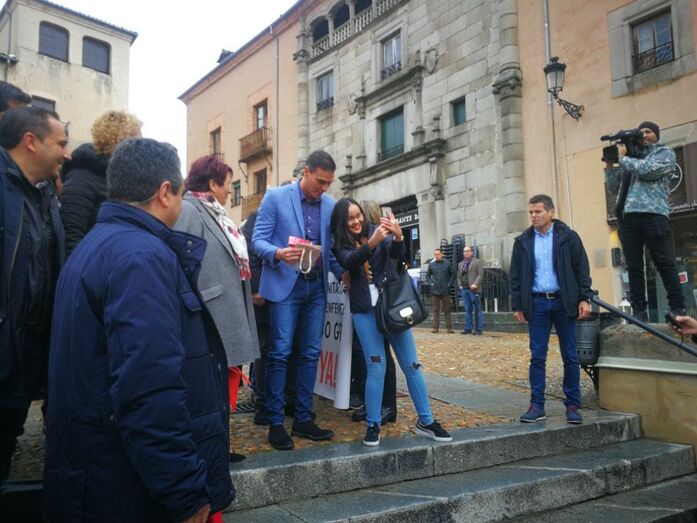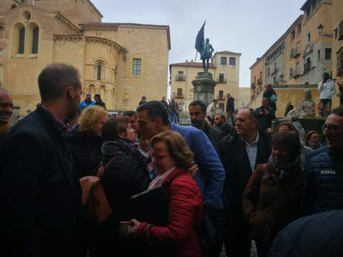 Pedro Sánchez ha pronunciado estas palabras en un acto electoral celebrado en la mañana de este miércoles en La Alhóndiga de Segovia. La alcaldesa de la ciudad, Clara Luquero, la primera en tomar la palabra, ha señalado a Pedro Sánchez que "Segovia siempre te ha traído suerte, y la tónica tiene que seguir". Y le ha felicitado tanto por la actuación de las fuerzas y cuerpos de seguridad en Cataluña, como por la exhumación de Franco."Aquí está el presidente. Siempre que se compromete, siempre está en Segovia", ha recordado el cabeza de lista del PSOE de Segovia al Congreso, José Luis Aceves, recordando la visita frustrada de Pedro Sánchez a la ciudad del Acueducto el pasado viernes, 18 de octubre, cuando el trato dado a los medios le valió al PSOE una carta de reprobación por parte de la Asociación de Periodistas de Segovia.