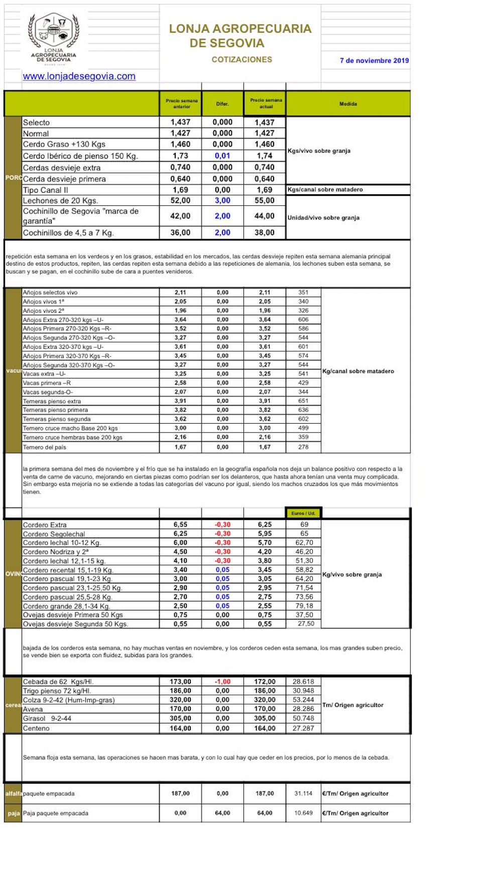 AgropecuariaLonja Agropecuaria de Segovia: Cotizaciones 7 de noviembre de 2019