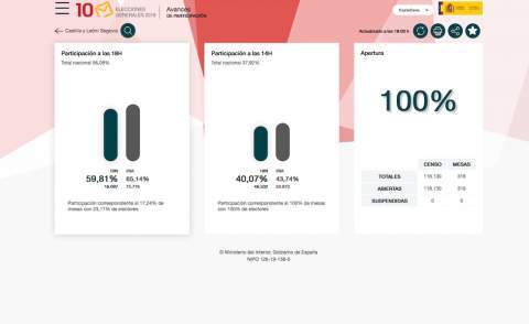 [Img #53277]A nivel nacional, el 10N la participación a las 14:00 h. ha sido del 37,93% (13.224.988), frente al 28A, cuando la participación a la misma hora fue del 41,49% (14.437.177).