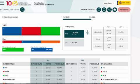 Del mismo modo, en Segovia, la bajada de la participación ronda los cinco puntos porcentuales. En Segovia, este 10N, a las 18:00 horas, la participación ha sido del 60,16%, frente al 65,14% del pasado 28 de abril a la misma hora.