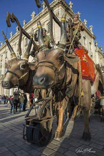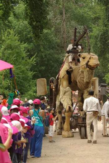 Desde la Plaza Mayor, unos animales típicos de Oriente, un gran camello y dos vacas sagradas, se unirán a la Cabalgata para acompañar a SSMM. Son los protagonistas del espectáculo Chamôh et les Vaches sacrées de la compañía francesa Paris Bénarès. El gran camello es un animal articulado de madera y pelo de 4´8 metros de alto, 2,5 de ancho y 6 metros de largo, con un peso de 2 toneladas. Sin embargo, camina por los espacios urbanos sin dificultad, come de los árboles, juega con el público y se deja acariciar por él. Ha recorrido todo el mundo en más de 200 representaciones. Las vacas sagradas poseen las mismas dimensiones. Van recorriendo su camino interactuando entre ellas y con el público, luciendo sus bonitos adornos. Una creación que recorre distintos festivales desde 2016.