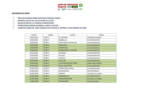 Como es costumbre de Unión de Campesinos de Segovia-UCCL, en los próximos días celebrarán una serie de asambleas informativas por diferentes pueblos de Segovia en los que informarán de las novedades de la PAC, así como de lo que se sabe de la reforma, temas de sanidad animal u otros puntuales de cada zona, además aprovecharán para informar de los motivos que los han llevado a convocar la tractorada e invitarles a participar, bien sea con sus tractores o a pie.