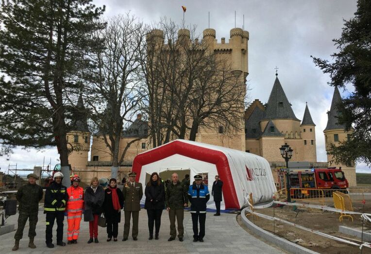 La alcaldesa de Segovia, Clara Luquero,acompañada de las concejalas de Seguridad, Raquel de Frutos, y Urbanismo, Clara Martín, ha asistido este viernes a la comprobación que cada año realiza el Servicio de Prevención y Extinción de Incendios de la capital del sistema contra incendios con el que cuenta el Alcázar.