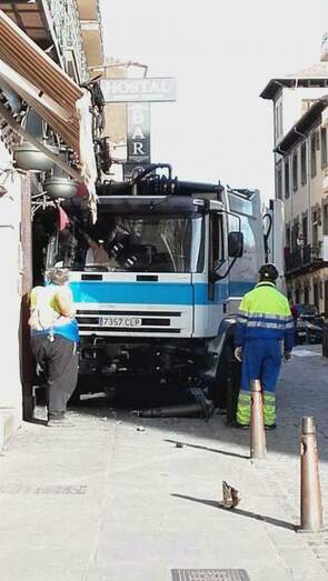 El fallo de dirección de un camión de basura impacta en la fachada del Restaurante José María "sin mayores consecuencias"