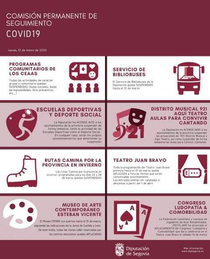 Por tercer día consecutivo, la Comisión Permanente de Seguimiento COVID-19 de la Diputación de Segovia se ha reunido, con el objetivo de revisar y evaluar las medidas adoptadas estos días, así como de continuar analizando la situación y de tomar nuevas decisiones vinculadas a las medidas de prevención respecto a la crisis sanitaria originada por el conocido como Coronavirus.